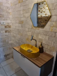 Aqui, os tijolinhos em pedra natural clara trazem leveza e elegância ao espaço. A combinação com espelho geométrico e cuba amarela artesanal dá um toque de exclusividade ao lavabo. Perfeito para quem busca um ambiente clean, mas com personalidade.